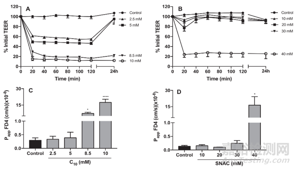 圖1. C10(左圖A和C)和SNAC(右圖B和D)對Caco-2細(xì)胞單層膜的影響[3]