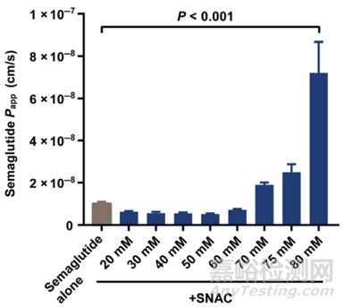 圖2. NCI-N87單層細(xì)胞中不同SNAC濃度對司美格魯肽體外滲透系數(shù)Papp值的影響[5]
