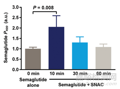 Stephen等人[6]采用Ussing chamber模型,研究SNAC對司美格魯肽在大鼠胃黏膜的滲透性影響。大鼠胃黏膜在SNAC中持續(xù)暴露10分鐘,接著移走SNAC,分別在10分鐘,30分鐘和60分鐘加入司美格魯肽。結(jié)果顯示,司美格魯肽的滲透性在10分鐘加入時最高,30分鐘和60分鐘加入時已經(jīng)恢復(fù)到基線水平,見圖3。說明SNAC的促滲透作用是短暫的。