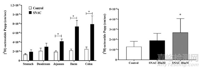 圖4. 奧曲肽在大鼠各腸段(左圖)和人結(jié)腸(右圖)上皮粘膜的滲透性[7]