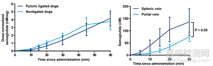 圖6. 口服司美格魯肽在幽門結(jié)扎和不結(jié)扎的Beagle犬中吸收曲線(左圖)和口服司美格魯肽在犬脾靜脈和肝門靜脈中的吸收曲線(右圖)[6]