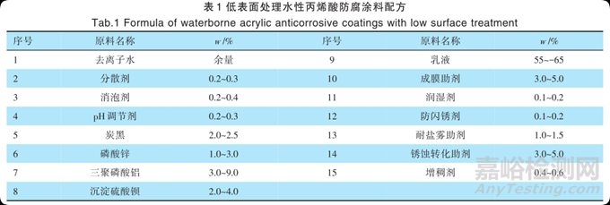 為了提升涂料的貯存穩(wěn)定性,本研究先將表 1 配方中的去離子水、分散劑、消泡劑、pH 調(diào)節(jié)劑、炭黑沉淀硫酸鋇及兩種活性防銹顏料加入分散釜中充分?jǐn)嚢璨⒒旌?,再利用砂磨機(jī)將其研磨至細(xì)度≤25μm。在低剪切力下將研磨黑漿與乳液混合均勻,利用分步增稠工藝先加入部分增稠劑提高釜中剪切力,再緩慢加入成膜助劑、潤(rùn)濕劑、防閃銹劑、耐鹽霧助劑、銹蝕轉(zhuǎn)化助劑及剩余量的增稠劑,再高速攪拌使其分散均勻,制得低表面處理水性丙烯酸防腐涂料。