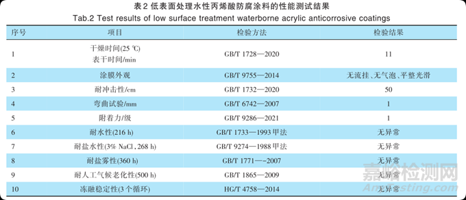 根據(jù)國(guó)標(biāo)或企標(biāo)進(jìn)行涂層的性能測(cè)試:依據(jù) GB/T 1728—2020 測(cè) 定 涂 膜 的 干 燥 時(shí) 間 ;依 據(jù) GB/T9755—2014 目測(cè)涂膜的外觀;依據(jù) GB/T 1732—2020測(cè)定涂膜的耐沖擊性;依據(jù) GB/T 6742—2007 測(cè)定涂膜的柔韌性;依據(jù) GB/T 9286—2021 測(cè)定涂膜的附著力;依據(jù) GB/T 1733—1993 甲法測(cè)定涂膜的耐水性;依據(jù) GB/T 9274—1988 甲法測(cè)定涂膜的耐鹽水性;依據(jù) GB/T 1771—2007 測(cè)定涂膜的耐鹽霧性;依據(jù) GB/T1865—2009測(cè)定涂膜的耐人工氣候老化性;依據(jù)HG/T 4758—2014測(cè)定涂料的凍融穩(wěn)定性。