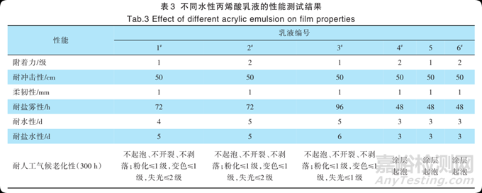 為了測(cè)試不同廠家水性丙烯酸乳液的耐腐蝕性能,本研究以乳液種類作為變量,同等加入適量成膜助劑、顏填料及各類助劑組成基礎(chǔ)配方,對(duì)比不同乳液所制備涂料的性能,實(shí)驗(yàn)結(jié)果見表3。