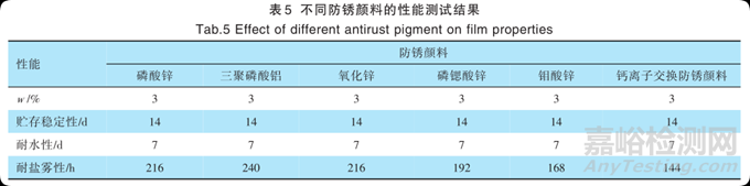 近年來由于環(huán)境污染問題漸漸淡水性涂料舞臺(tái);磷酸鋅是目前應(yīng)用最多的防銹顏料,它依靠磷酸鹽水解生成的PO43- 與Fe3+ 反應(yīng),在金屬表面生成難溶的磷酸鐵鹽達(dá)到防銹的效果,對(duì)磷酸鋅改性能夠增加反應(yīng)活性位點(diǎn),使其具有強(qiáng)氧化性實(shí)現(xiàn)對(duì)基材的鈍化;氧化鋅是種堿性防銹顏料,它能與 γ-FeOOH發(fā)生反應(yīng)并使其轉(zhuǎn)變成惰性物質(zhì),氧化鋅的堿性對(duì)電化學(xué)的陰極反應(yīng)具有一定的抑制作用,從而改善了涂膜的耐蝕性;三聚磷酸鋁是一種重要的聚磷酸鹽防銹顏料,其分解形成的 P3O105- 可與鐵離子螯合形成保護(hù)層,P3O105-的降解產(chǎn)物與金屬離子也有良好的配位作用,通過對(duì)三聚磷酸鋁改性能夠改善水性涂料體系的穩(wěn)定性。本研究通過對(duì)比試驗(yàn),探究不同防銹顏料對(duì)涂層耐腐蝕性的影響,結(jié)果見表5。