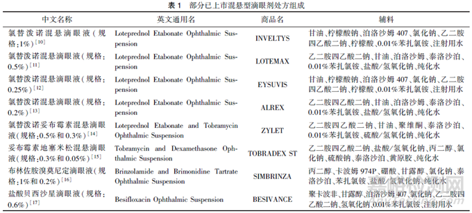 通常, 已上市的國(guó)內(nèi)外混懸型滴眼劑說明書中公開了輔料的種類。參考FDA公布的說明書, 表1中列舉了部分混懸型滴眼劑中處方組成。