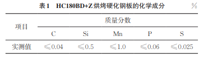 試驗(yàn)材料為HC180BD+Z烘烤硬化鋼板,厚度為0.65mm,該鋼板的化學(xué)成分如表1所示。