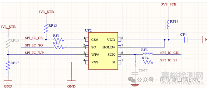 使用不同品牌的SPI Flash時(shí),SPI Flash芯片在工作時(shí)產(chǎn)生噪聲能量差異,表現(xiàn)為輻射發(fā)射測(cè)試結(jié)果的巨大差異,初步判斷是芯片內(nèi)部串?dāng)_耦合差異,屬于芯片來(lái)料差異。