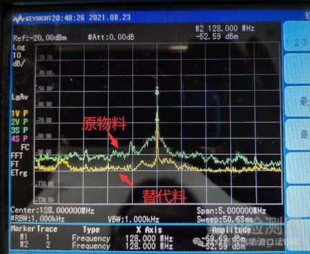 使用頻譜分析儀分別量測(cè)兩款SPI Flash芯片引腳噪聲情況,發(fā)現(xiàn)原物料芯片引腳的噪聲要遠(yuǎn)小于替代物料芯片引腳的噪聲,測(cè)試頻譜對(duì)比如下圖所示: