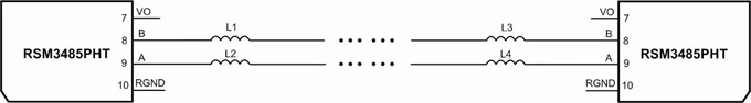 如圖 4所示的電路,兩個RSM3485PHT模塊AB接口分別串聯(lián)了磁珠,能夠達(dá)到IEC 61000-4-4 ±4kV,并能夠有效降低通信誤碼率,僅在電路中串聯(lián)了磁珠,非常的便宜有效,如果要求的EFT抗擾度等級更高,那么可以適當(dāng)增加磁珠的數(shù)量。