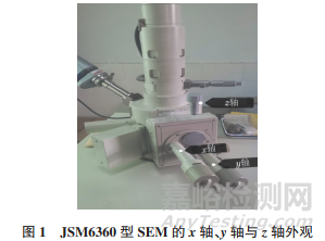 JSM 6360型掃描電鏡的x軸、y軸設(shè)置在真空腔室外(見圖1)。每個(gè)軸都由一個(gè)專用馬達(dá)控制,JSM 6360型掃描電鏡的x軸出現(xiàn)不能自動(dòng)旋轉(zhuǎn)故障,y軸可以正常自動(dòng)控制旋轉(zhuǎn)。更換了新的x軸后,故障暫時(shí)得到解決,但過段時(shí)間x軸又出現(xiàn)不能自動(dòng)旋轉(zhuǎn)故障,需手動(dòng)旋轉(zhuǎn)x軸。在SEM從低倍到高倍的使用過程中,從一個(gè)區(qū)域到另一個(gè)區(qū)域的鼠標(biāo)雙擊移動(dòng)時(shí),易出現(xiàn)跳出x軸、y軸最大量程外,造成x軸卡頓現(xiàn)象。