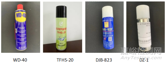從國(guó)內(nèi)外選取了四種電子電氣類(lèi)的緩蝕劑作為本次試驗(yàn)的測(cè)試品,見(jiàn)表2和圖2所示。產(chǎn)品均為自噴罐型,樣品在試驗(yàn)前應(yīng)充分地?fù)u勻,從噴霧罐中得到緩蝕劑在燒杯里在室溫下靜置30min以上,以使推進(jìn)劑完全消散。