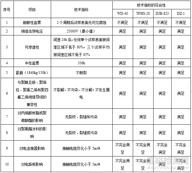 1)對(duì)于絕緣擊穿電壓、功能滲透性、氫脆試驗(yàn)、耐中性鹽霧、與絕緣導(dǎo)線的兼容性、對(duì)丙烯酸樹(shù)脂或聚碳酸酯的影響、對(duì)聚氨酯涂料的影響七項(xiàng)試驗(yàn),四種電子電氣緩蝕劑都能夠有效的滿足技術(shù)指標(biāo)的要求;