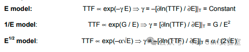 注:其中E是電介質(zhì)中的電場,T是確定γ時的固定溫度,TTF被視為TDDB測試的特征失效時間。G和α分別是1/E和√E模型中的場加速參數(shù)。