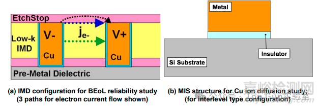 注:在沉積覆蓋電介質(zhì)之前,對銅金屬化進(jìn)行化學(xué)機械拋光(CMP)和清洗可能會留下銅離子缺陷,這些缺陷未被阻擋材料完全與low k材質(zhì)電介質(zhì)隔絕。在施加的電應(yīng)力條件下,銅離子可以穿過電介質(zhì)區(qū)域發(fā)生漂移,導(dǎo)致金屬間電介質(zhì)(IMD)過早失效。嚴(yán)重的缺陷會對觀察到的TDDB可靠性產(chǎn)生負(fù)面影響。