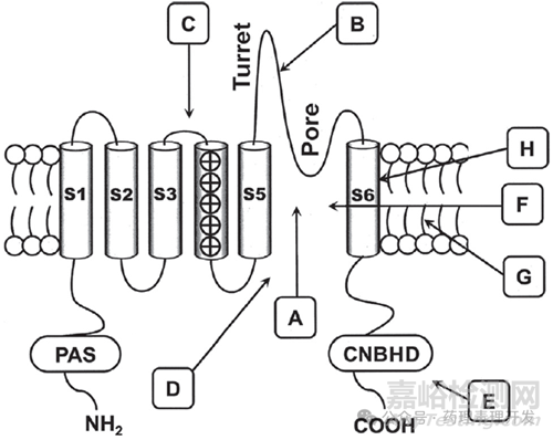 當然,本篇文章的主角是hERG,一種電壓門控鉀離子通道,如下圖所示,hERG是由4個相同亞單位組成,每個亞單位包含6個跨膜螺旋區(qū)(S1-S6)。其中,S1-S2由24個氨基酸連接,S3-S4由4個氨基酸連接。S4包含5個帶正電荷的殘基,發(fā)揮電壓傳感作用(voltage sensor)。S5和S6共同形成通道孔。