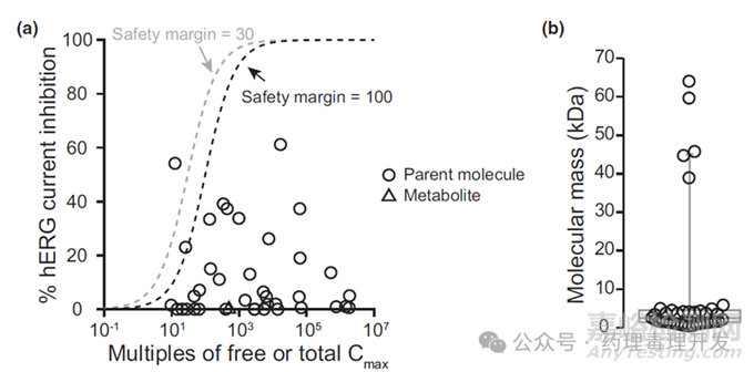 那么多肽或者分子量比抗體小的蛋白對hERG的影響如何呢。Wu等人研究過在FDA申報的38種多肽和蛋白對hERG的影響,并以題為ICH S7B in vitro assays do not address mechanisms of QTC prolongation for peptides and proteins-data in support of not needing dedicated QTC studies的文章發(fā)表。發(fā)現(xiàn)在高濃度下,2個產(chǎn)品出現(xiàn)≥50% hERG抑制,8個產(chǎn)品出現(xiàn)20-40%抑制。不過,未見體內(nèi)QTc間期的延長,可能與臨床暴露濃度低于體外hERG抑制濃度有關。如下圖所示,左圖顯示的是hERG抑制與臨床Cmax之間的關系,38個產(chǎn)品中,采用100倍或者30倍的安全窗口,≥95%的產(chǎn)品hERG抑制均是陰性。右圖顯示的是38個產(chǎn)品的分子量分布,其中33個(87%)產(chǎn)品的分子量低于6KDa。