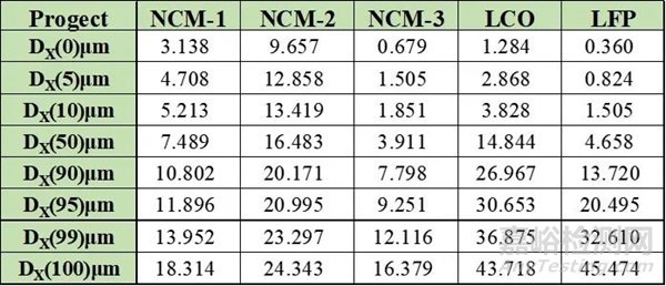 本文主要結(jié)合卸壓模式對不同正極材料加壓、卸壓及反彈壓實(shí)密度差異進(jìn)行評估。如表1為所選樣品的粒徑分布表,其中1號樣品工藝上明確為多晶空心球,2號樣品為多晶實(shí)心球,3號樣品為單晶球。如圖3分別為加壓(a)、卸壓(b)及反彈壓實(shí)密度(c)示意圖,從加壓和卸壓曲線上看,加壓壓實(shí)密度與卸壓壓實(shí)密度隨壓強(qiáng)變化有相同的變化趨勢,且不同樣品間的差異趨勢總體一致,壓實(shí)密度均呈現(xiàn)LCO>NCM>LFP;但反彈壓實(shí)密度的變化有明顯差異,其中NCM-1、NCM-2、NCM-3三者對比單晶的3號樣品,卸壓后呈現(xiàn)更大的壓實(shí)密度反彈,考慮整體顆粒與顆粒間的存在更大的內(nèi)應(yīng)力;NCM-1呈現(xiàn)最小的反彈,考慮整體材料工藝設(shè)計(jì)端是空心球體,顆粒經(jīng)大壓強(qiáng)受壓后,顆粒自身會(huì)發(fā)生不可回彈的變形,壓力卸載后形變回彈較小,NCM-2樣品的壓實(shí)密度回彈介于兩者之間。另外,LCO和LFP的反彈壓實(shí)密度也相對于加壓和卸壓有明顯的趨勢差異,主要和材料本身形貌結(jié)構(gòu)及力學(xué)性能變化有直接關(guān)聯(lián)。