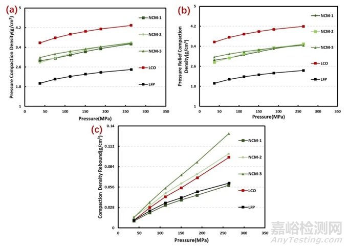 本文選取不同粒徑分布的5款正極粉體材料,進(jìn)行加壓、卸壓&反彈壓密的對比評估,明確加壓和卸壓條件下的壓實(shí)密度變化差異,同時(shí)通過反彈壓實(shí)密度的變化趨勢,可初步明確其反彈和材料工藝及力學(xué)性能的關(guān)聯(lián)性,實(shí)際在壓實(shí)密度的測定過程中,除了基礎(chǔ)參數(shù)如模具尺寸、取樣量、壓強(qiáng)選擇等的選擇外,也要進(jìn)一步明確壓實(shí)密度的加壓/卸壓評估條件;除此之外,亦可借助于壓實(shí)密度測定平臺(tái)進(jìn)一步評估材料的力學(xué)反彈性能變化。
