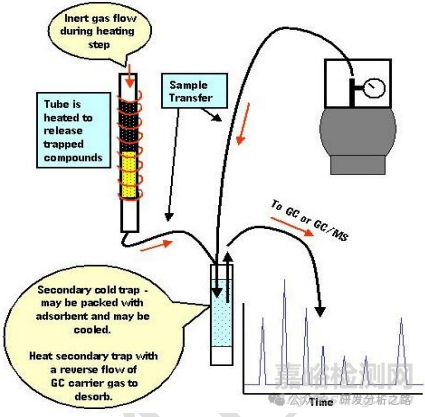 分析過程分成兩部分,吸附和解吸。以空氣為例,樣品空氣由特定裝置驅(qū)動(dòng)通過吸附管, 目標(biāo)組分被吸附其中。然后加熱吸附管,目標(biāo)組分被解吸進(jìn)入氣相色譜儀,一般會(huì)在吸附管后 加冷阱,更容易獲得尖銳色譜峰。
