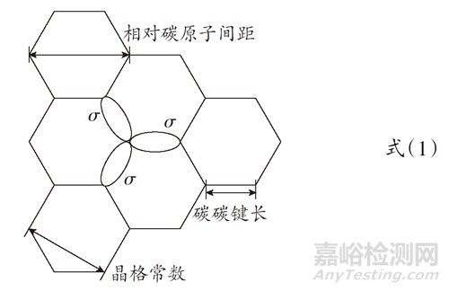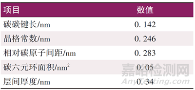石墨烯是單層碳原子以蜂窩形式組成的二維片層晶體,是已知最薄的材料,原子厚度約0.1 nm,原子力顯微鏡測定的層間厚度約為0.34 nm。一個碳六元環(huán)包含2個碳原子,其面密度為0.77 mg/m2,單層石墨烯比表面積可高達(dá)2 630 m2/g。其示意圖和幾何參數(shù)見式(1)和表1。