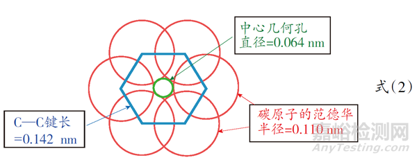 考慮碳原子的范德華半徑(rvdw),石墨烯每個蜂窩形碳原子環(huán)中心可供滲透的直徑尺寸僅為0.064 nm[式(2)],高質(zhì)量無缺陷石墨烯晶體,具有優(yōu)異的力學(xué)性能,對所有原子、離子和氣體分子不可滲透,即對所有腐蝕介質(zhì)均不可滲透。