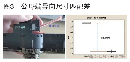 例如開(kāi)音量調(diào)節(jié)開(kāi)關(guān), 線束母端為MOLEX 標(biāo)準(zhǔn)件,開(kāi)關(guān)為供應(yīng)商注塑件,公母端導(dǎo)向尺寸配合相差超過(guò)0.5mm,加上開(kāi)關(guān)屬于盲插插接件,人機(jī)工程差,員工無(wú)法保證平直對(duì)配,造成端子歪斜插入維修孔,如果公端硬碰母端塑殼造成退針,兩者失效模式都會(huì)產(chǎn)生開(kāi)關(guān)功能失效。