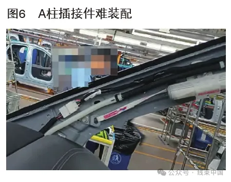 改善措施:優(yōu)化工藝裝配順序,先對(duì)配頂棚線束和車身線束,對(duì)配時(shí)線束自由狀態(tài)存在較大的操作空間,可以按照設(shè)計(jì)要求,按壓塑殼鎖止機(jī)構(gòu)裝配,然后再固定插接件的鈑金卡,這樣既減小了對(duì)配的阻力,又改善了平直對(duì)配的作業(yè)環(huán)境,有效解決緊靠A柱鈑金造成的插接問(wèn)題。工藝環(huán)節(jié)要梳理現(xiàn)場(chǎng)實(shí)際操作的人機(jī)工程、工藝布局等是否合理,并給予改善。