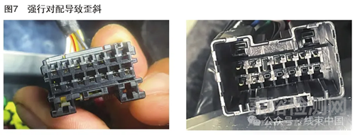 例如下圖是某車型直流充電系統(tǒng)的一個(gè)低壓控制回路插接件,母端護(hù)套有被公端插接的痕跡,判斷由于公端有歪斜強(qiáng)行對(duì)配將公端對(duì)配至母端維修孔內(nèi)造成的問(wèn)題。實(shí)測(cè)歪斜對(duì)配阻力38N,正常對(duì)配20N 以內(nèi)。
