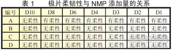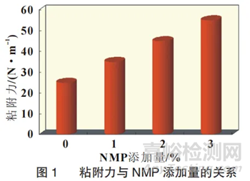 圖1為LiFePO4極片180°彎折粘附力測試圖,觀察圖1可發(fā)現(xiàn),極片的粘附力由于NMP的加入得到顯著提高,且極片粘附力提高與NMP的添加量成正比。粘附力是范德華力的一種,取決于分子之間的作用力。