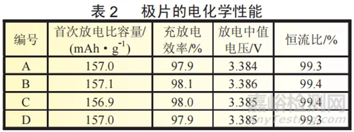 表2所示為極片的電化學性能測試結(jié)果。首次放電比容量、充放電效率、放電中值電壓和恒流比的數(shù)值也基本相同。這說明添加NMP對正極片的正極活性物質(zhì)的放電容量和充放電特性沒有影響。