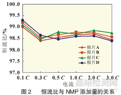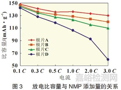 極片A和B的放電比容量和中值電壓,在不同放電倍率時基本相等。隨著放電倍率的增加,極片C和極片D的中值電壓和放電比容量逐漸增大,由此看出,當添加不高于1%的NMP時,電池的倍率放電性能不會受到影響;當添加高于1%的NMP時,NMP會影響正極的放電比容量和中值電壓。