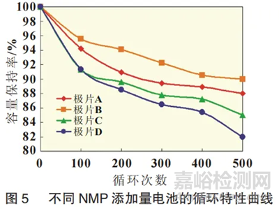圖5所示為4種電池的循環(huán)性能曲線,觀察圖5可發(fā)現(xiàn),剛開始進行充放電循環(huán)時,極片A和極片B的容量衰減趨勢相近,極片C與極片D的容量衰減趨勢相近,而極片C和極片D的衰減速度較大。隨著循環(huán)的繼續(xù)進行,極片A、C和D的衰減加速,極片B衰減速度基本不變,最終電池容量保持率為極片D<C<A<B。這說明當NMP添加量小于1%時有利于提高電池的循環(huán)特性,當NMP添加量大于1%后電池的循環(huán)特性會受到影響。