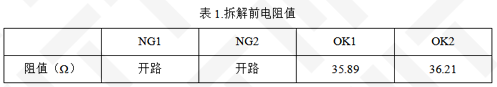 由表1可知,NG1和NG2拆解前為開路,OK件阻值約為36Ω。