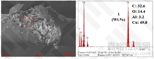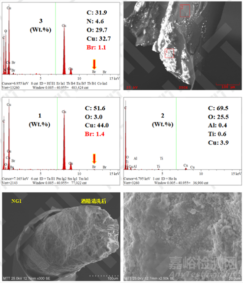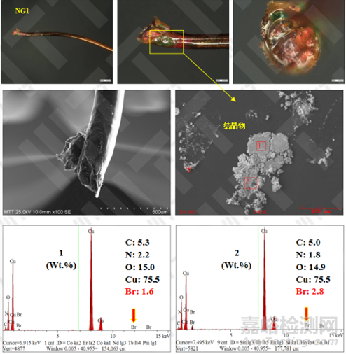 對(duì)其他位置斷線斷口進(jìn)行觀察,斷口表面可見藍(lán)/綠色結(jié)晶物,將結(jié)晶物從銅線上取下后進(jìn)行能譜分析,發(fā)現(xiàn)存在Br元素,結(jié)晶產(chǎn)物疑似為Cu\Br元素有關(guān)的晶體。