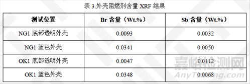 檢測(cè)發(fā)現(xiàn)在藍(lán)色與透明殼體內(nèi)存在微量常見的阻燃劑Br、Sb,推測(cè)可能為回收料混入形成雜質(zhì)元素,造粒時(shí)經(jīng)過高溫處理,Br以離子分解析出。