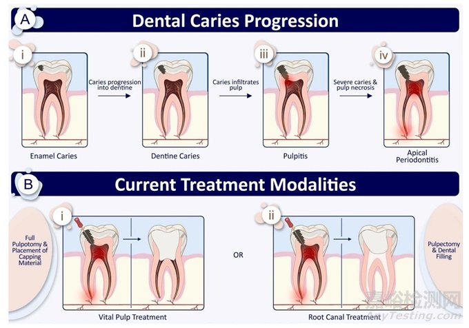 圖1:齲齒進(jìn)展和當(dāng)前治療方式。(A)齲齒進(jìn)展(i)口腔生物膜引起過多的膳食碳水化合物發(fā)酵,導(dǎo)致牙釉質(zhì)脫礦(ii)齲齒發(fā)展到牙本質(zhì),刺激牙髓炎(iii)齲齒侵入牙髓,誘發(fā)牙髓炎(iv)齲齒未得到治療會(huì)導(dǎo)致牙髓壞死和隨后的根尖周炎。(B)當(dāng)前的治療方式(i)活髓治療涉及全牙髓切斷術(shù)和封蓋材料,可引起修復(fù)反應(yīng)(ii)根管治療采用牙髓切除術(shù),然后進(jìn)行牙齒填充,這是一種破壞性且昂貴的治療方法。