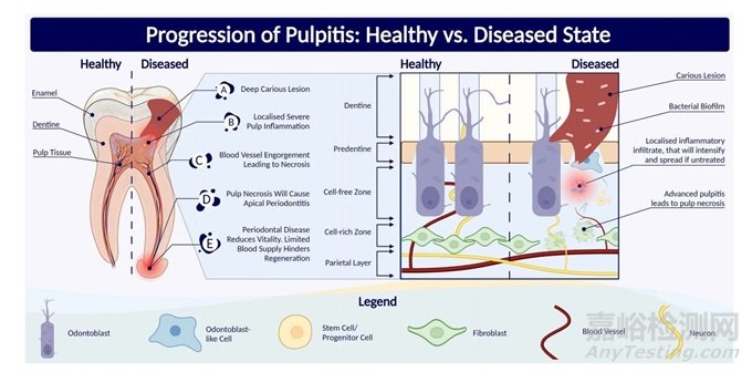 齲齒雖然是一種可預(yù)防的非傳染性疾病,但仍是一種普遍存在的傳染病,給全世界的醫(yī)療保健系統(tǒng)和患者帶來了沉重的負(fù)擔(dān)。齲齒過程破壞牙釉質(zhì)外殼后,首先會(huì)刺激牙髓發(fā)炎(“牙髓炎”),并經(jīng)常伴有疼痛(“牙痛”)。如果不及時(shí)治療,牙髓炎會(huì)加重,最終導(dǎo)致牙髓死亡和壞死。保守根管治療的最新進(jìn)展使人們對(duì)齲齒的了解有所增加牙髓再生能力的提高,導(dǎo)致了各種再生牙髓治療(RET)的發(fā)展。這些RET已成為研究的焦點(diǎn),因?yàn)樗鼈兙哂谢謴?fù)天然牙組織的潛力,與傳統(tǒng)的晚期牙髓炎和牙髓壞死修復(fù)治療策略形成鮮明對(duì)比。傳統(tǒng)方法,如根管治療(RCT),涉及用惰性填充材料替換整個(gè)牙髓,以及活髓治療(VPT),僅用填充材料替換部分受損牙髓。RET程序包括通過細(xì)胞歸巢進(jìn)行牙髓復(fù)興和通過結(jié)構(gòu)化再生醫(yī)學(xué)技術(shù)進(jìn)行再生。然而,這兩種RET都呈現(xiàn)出不同的終點(diǎn),誘導(dǎo)壞死根管內(nèi)血管生成和牙髓再生,旨在功能性地重建成牙本質(zhì)細(xì)胞以及血管生成和神經(jīng)生成供應(yīng)。值得注意的是,盡管該領(lǐng)域有大量研究,并且牙髓具有固有的再生能力,但再生醫(yī)學(xué)方法尚未成功轉(zhuǎn)化為商業(yè)牙科產(chǎn)品。