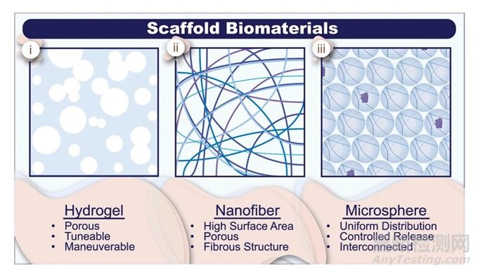 圖3:再生策略中采用的常見基于生物材料的方法。(i) 水凝膠支架具有多孔性,可模擬細(xì)胞外基質(zhì),促進(jìn)有效的營(yíng)養(yǎng)擴(kuò)散和廢物清除,并且由于其可操作性而在臨床上適用。(ii) 納米纖維支架具有高度多孔性和互連性,具有較大的表面積以促進(jìn)接種過程中增強(qiáng)的細(xì)胞粘附,其纖維結(jié)構(gòu)模擬天然細(xì)胞外基質(zhì)。(iii) 微球支架可控制釋放其中的生物活性劑。