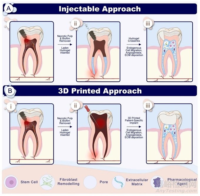 圖4:新型再生方法中采用的先進(jìn)技術(shù)。(A)注射方法(i)齲齒浸潤(rùn)牙髓會(huì)誘發(fā)牙髓炎(ii)去除壞死的牙髓和生物膜,將含有生物活性劑的水凝膠注入空根管(ii)通過適當(dāng)?shù)姆椒ń宦?lián)水凝膠并產(chǎn)生內(nèi)源性細(xì)胞遷移、血管生成和細(xì)胞外基質(zhì)沉積。(B)3D 打印方法(i)齲齒浸潤(rùn)牙髓會(huì)誘發(fā)牙髓炎(ii)去除壞死的牙髓和生物膜,然后形成一個(gè)大腔以適應(yīng)患者特定的含有生物活性劑的水凝膠,該水凝膠可誘導(dǎo)內(nèi)源性細(xì)胞遷移、血管生成和 ECM 沉積。