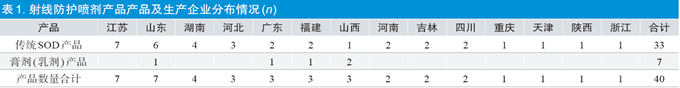 截至2024 年4 月,在國家藥品監(jiān)督管理局官網(wǎng)上,進入“醫(yī)療器械”板塊中,檢索詞設定為“射線防護噴劑”,篩選出該類產(chǎn)品34 個,其中,江蘇省7 個,山東省6 個,其余分布在12 個省,每個省2~3個;檢索詞設定為“射線防護劑”,篩選出廣東省、湖南省各1 個;檢索詞設定為“皮膚防護”,共有3 個省份的4 個產(chǎn)品,具體統(tǒng)計情況見表1、圖1。