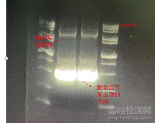 根據(jù)載體大小配置瓊脂糖凝膠并跑電泳,根據(jù)酶切片段計算片段出現(xiàn)的位置,以此判斷載體酶切是否成功,可能出現(xiàn)的結果如圖所示: