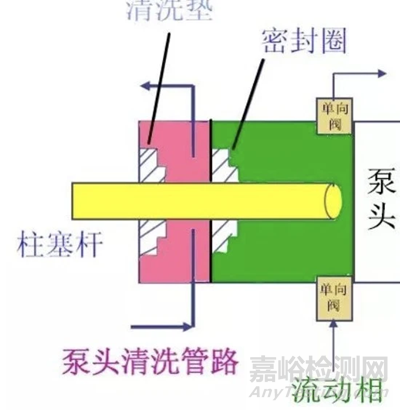 如上圖所示,清洗墊、密封圈、泵頭三者之間存在2個(gè)腔體。其中右邊的腔體,通過(guò)柱塞桿的往復(fù)運(yùn)動(dòng),流動(dòng)相經(jīng)單向閥進(jìn)入到色譜系統(tǒng),它屬于高壓流路。左邊的腔體中,由泵密封圈清洗液流經(jīng)清洗墊和密封圈之間起到清洗送液泵的柱塞密封圈和柱塞桿的作用,它屬于常壓流路。因此,通常都是使用蠕動(dòng)泵來(lái)進(jìn)行液體輸送。