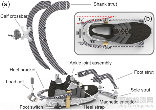 兩個關(guān)節(jié)組件連接節(jié)段并限制踝關(guān)節(jié)在50°跖屈至30°背屈之間旋轉(zhuǎn)。小腿部分通過尼龍搭扣連接到有襯墊的小腿包裹上,腳部分集成在跑鞋中。鮑登電纜連接足跟段和執(zhí)行器,向足跟帶傳遞向上的力,幫助踝關(guān)節(jié)跖屈,從而減少小腿肌肉的受力。幾項改進使末端執(zhí)行器更輕量和兼容。柄段包括兩個鉤形碳纖維支柱和一個x形橫梁。鉤形的幾何形狀旨在減少人腿和末端執(zhí)行器之間可能的接觸。柄碳纖維支撐在橫向平面上有10?內(nèi)旋轉(zhuǎn)(圖2(b))。大多數(shù)人在走路時通常會有幾度的腳趾,所以小腿支撐的內(nèi)部旋轉(zhuǎn)有助于避免末端執(zhí)行器之間可能的碰撞。碳纖維的彈性使跟托提供串聯(lián)彈性,從而減少了界面阻抗。為了減少應力集中,進一步將跟托從之前的折線形狀改進為流線型形狀(圖2(a))。高強度綁帶取代了之前的鞋跟繩,卡在鞋跟支架和關(guān)節(jié)組件之間,提供了兼容的界面和低壓力。