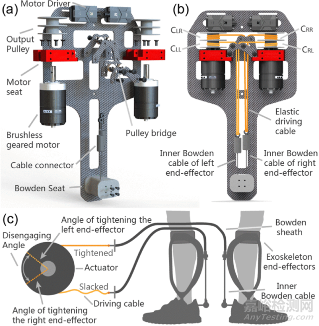 該研究為了提高驅(qū)動效率,將雙側(cè)踝關(guān)節(jié)外骨骼的兩個執(zhí)行器分別連接到兩側(cè)的末端執(zhí)行器上,在不同的步態(tài)階段,它們相互協(xié)作,交替地為每條腿提供輔助。在不增加系統(tǒng)重量的情況下,執(zhí)行器的并聯(lián)和協(xié)作使外骨骼的輔助能力增加了一倍。本研究的貢獻是:(a)開發(fā)了一種輕量級、可移動的雙側(cè)踝關(guān)節(jié)外骨骼系統(tǒng),該系統(tǒng)具有結(jié)構(gòu)優(yōu)化的末端執(zhí)行器和高效驅(qū)動。重量3.4公斤的系統(tǒng)可以為兩個腳踝提供80Nm的扭矩輔助,具有出色的功率/重量比。(b)通過并聯(lián)多個末端執(zhí)行器,提高了驅(qū)動效率。該設計方法有望擴展到其他電纜驅(qū)動的外骨骼,以提高輔助能力或減輕系統(tǒng)重量。(c)提出了一種基于迭代學習的反饋補償控制方法來克服鮑登索的非線性。實驗結(jié)果表明,該外骨骼具有較好的帶寬和扭矩跟蹤精度。