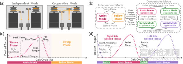 圖4:(a)不同驅(qū)動配置的原理圖 (b)設計的運行狀態(tài)機狀態(tài)轉(zhuǎn)換圖 (c)獨立模式下參數(shù)化的扭矩分布圖 (d)合作模式下兩個踝關(guān)節(jié)的期望扭矩分布圖(圖片來自原文)