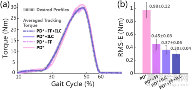 3)扭矩控制器評估:對PD*、PD*+FF、PD*+ILC和PD*+FF+ILC控制器進行了獨立配置測試。一位經(jīng)驗豐富的用戶(男性,1.72米,70公斤)在跑步機上以1.25 ms−1的速度行走外骨骼。將所需扭矩曲線的上升時間、下降時間、峰值時間和峰值扭矩分別設置為25%、10%、48%和30Nm。在數(shù)據(jù)收集前的行走過程中對控制參數(shù)進行了很好的調(diào)整。對于每個被測控制器,在2分鐘的自適應行走和1分鐘的迭代學習后,收集1分鐘的穩(wěn)態(tài)數(shù)據(jù)。取兩側(cè)踝關(guān)節(jié)測量扭矩的平均值,計算均方根誤差(RMS-E)(圖6(b))。通過模型補償,PD*+FF控制器的響應速度比簡單PD*控制器快,RMS-E顯著降低(0.98 ~ 0.45 Nm)。PD*+ILC和PD*+FF+ILC控制器可以消除大多數(shù)誤差,沖擊和變化較小。集成PD*+FF+ILC控制器實現(xiàn)了最低的RMS-E (0.30Nm,峰值扭矩的1%)。