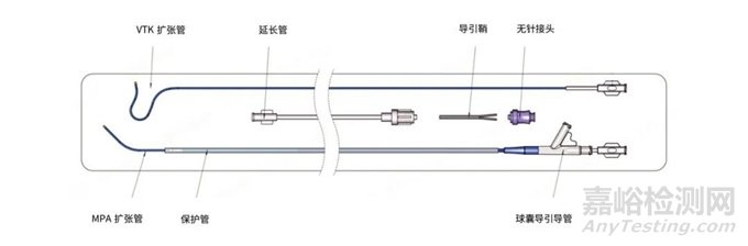 結(jié)構(gòu)及組成:該產(chǎn)品由管體、顯影標記、球囊、應力釋放管和接頭組成。附件包含導引鞘、無針接頭、延長管、MPA擴張管、VTK擴張管。