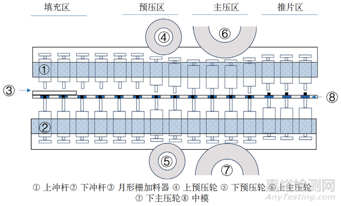 經(jīng)過(guò)刮粉區(qū)、預(yù)壓區(qū)、主壓區(qū)、出片區(qū)、余料回收除粉區(qū),形成一個(gè)循環(huán),將物料壓制成片,連續(xù)的壓片就是這個(gè)循環(huán)的重復(fù)進(jìn)行。