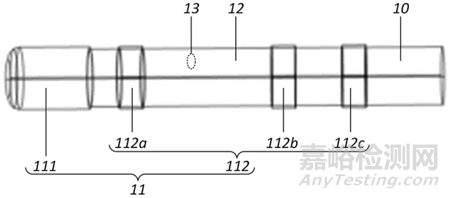 使用中,實(shí)際進(jìn)行放電的電極可在各電極11間選擇,頭電極111在周向上呈環(huán)形, 其置于絕緣層12的內(nèi)部或者外部均可。其上可以開(kāi)設(shè)灌注孔,起到鹽水灌注的作用;還可以設(shè)置溫度傳感器,起到監(jiān)控組織溫度的作用;遠(yuǎn)端可以開(kāi)設(shè)有朝向近端的凹槽,起到匯聚頭端能量的作用。